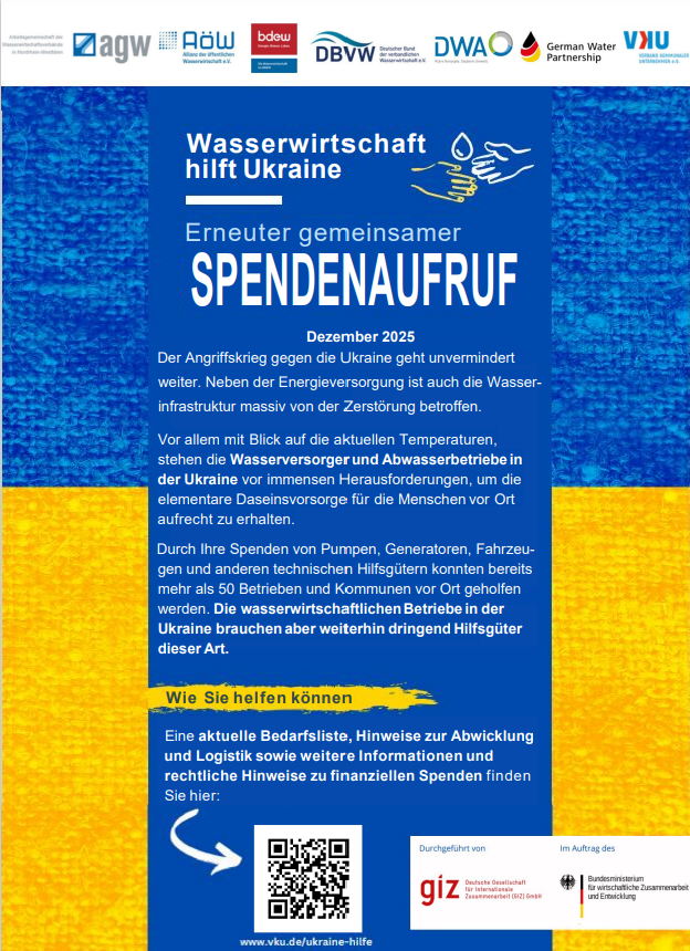 Im Namen der Verbände agw, AöW, BDEW, DBVW, DWA, GWP und VKU laden wir Sie herzlich zu unserer digitalen Infoveranstaltung „Spendenplattform Ukraine“ ein (Anmeldung nicht nötig).